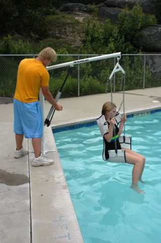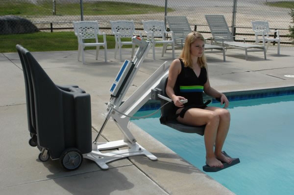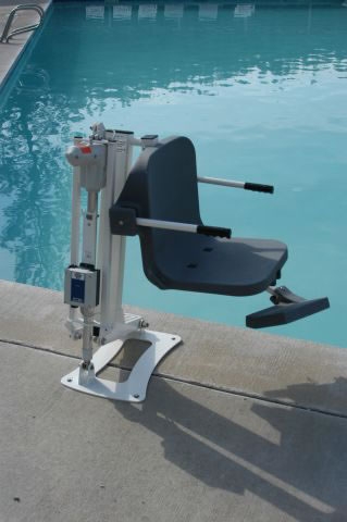 Dizalo za spuštanje invalidnih osoba u bazene omogućuje invalidnim osobama u kolicima jednostavan i siguran ulazak u bazene, radi osvježenja ili radi vodene gimnastike. Pomoću hidrauličnog sjedišta, kojega vrlo jednostavno postavljamo uz bazensku stjenku i uz priključak iz vodovodne instalacije (pritisak između 3,5 i 5 bara), omogućujemo olakšan ulaz u bazen i ovim osobama, jer rukovanje ovim sjedištem je vrlo jednostavno.